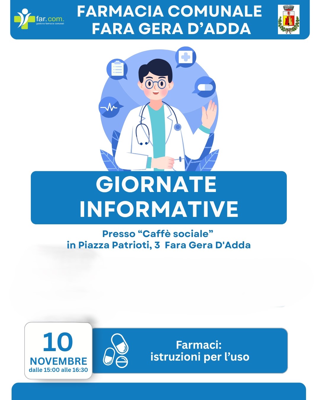 Si terrà, Lunedì 10 Novembre dalle 15.00 alle 16.30, presso il "Caffè Sociale" in Piazza Patroti n. 3, la giornata informativa sull'istruzione dell'uso dei farmaci promossa dal Comune di Fara Gera d'Adda in collaborazione con la Farcom comunale.