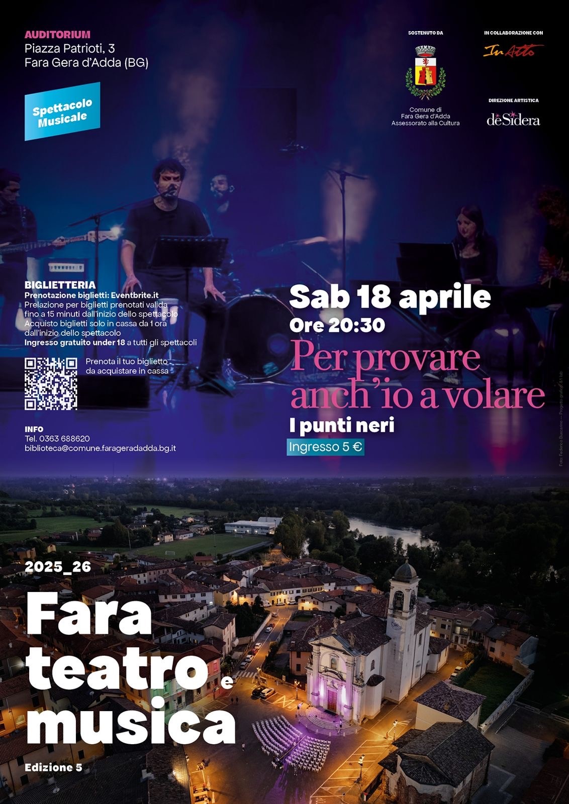 Il Comune di Fara Gera d'Adda, attraverso l'Assessorato alla Cultura, organizza per sabato 18 aprile alle ore 20:30, presso l'Auditorium di Piazza Patrioti, uno spettacolo musicale inserito nella rassegna Fara Teatro e Musica.