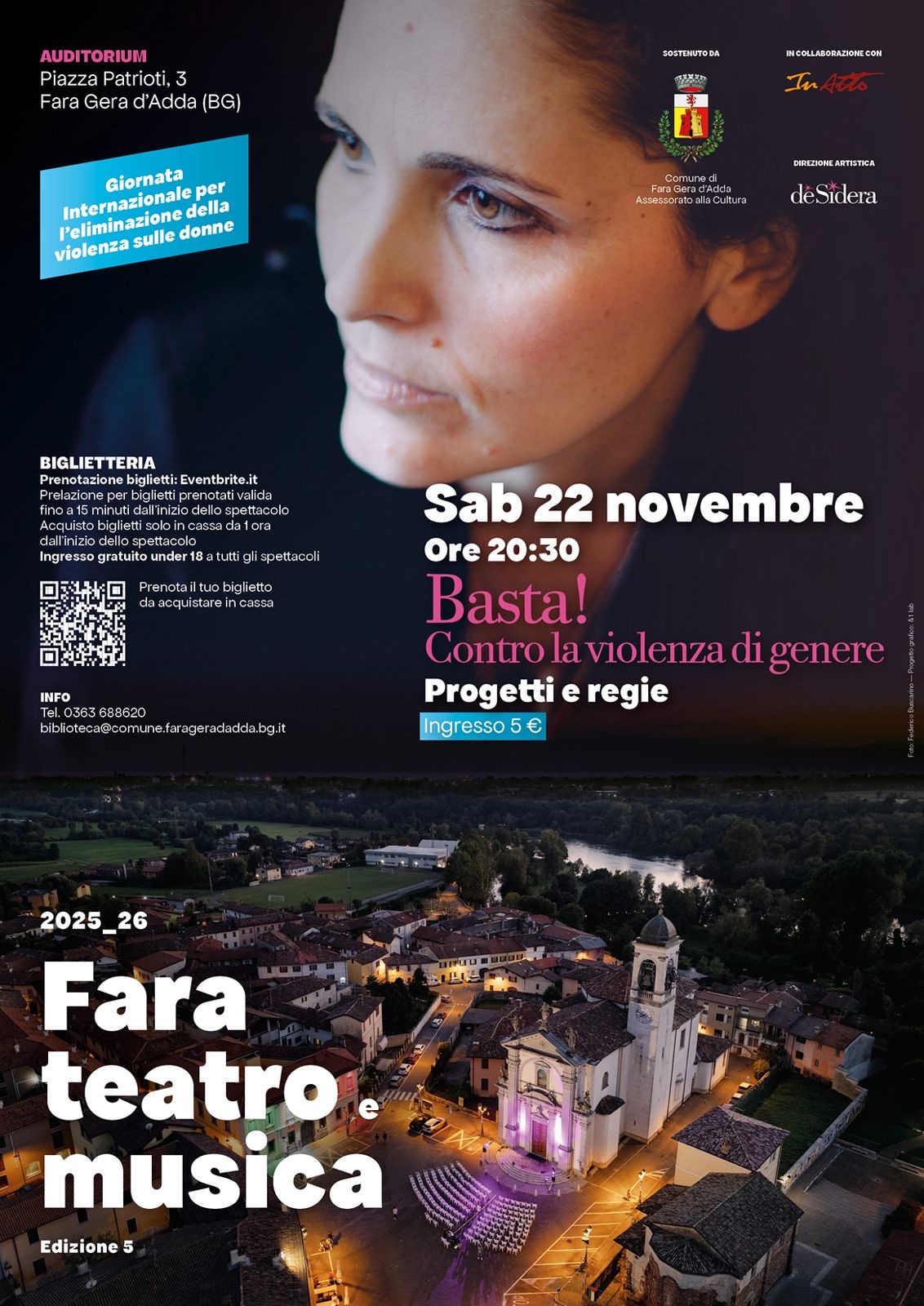 Sabato 22 novembre alle ore 20:30, presso l’Auditorium di Piazza Patrioti 3 a Fara Gera d’Adda (BG), il pubblico potrà assistere allo spettacolo BASTA!, interpretato da Laura Mantovi con proiezioni video curate da Sara Poli e prodotta da Progetti e Regie.