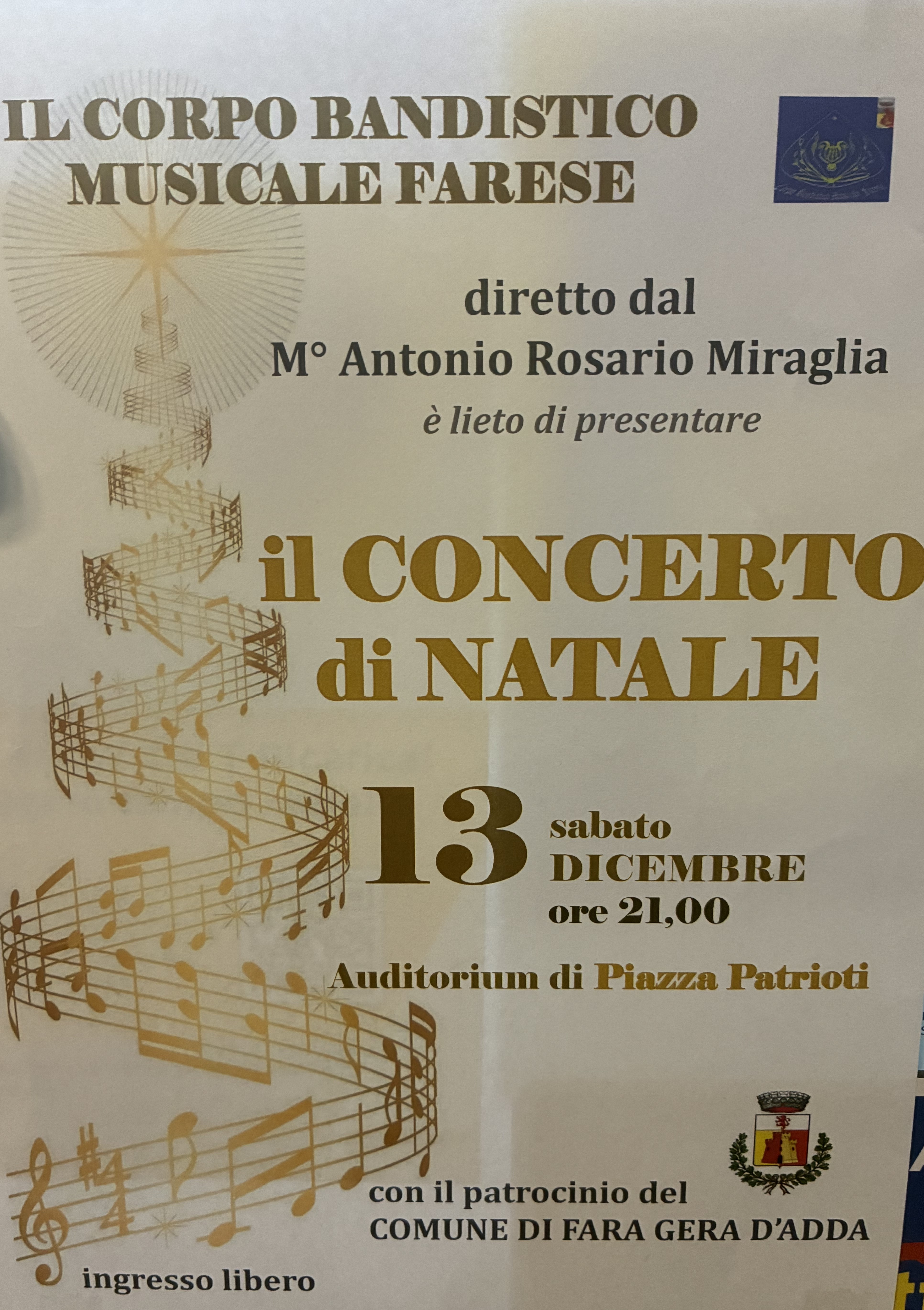 Sabato 13 dicembre, alle ore 21.00, presso l'Auditorium di Piazza Patrioti, il Corpo Bandistico Musicale Farese avrà il piacere di offrire il Concerto di Natale. Sotto la direzione del Maestro Antonio Rosario Miraglia, l'evento natalizio sarà organizzato con il patrocinio del Comune di Fara Gera d'Adda.