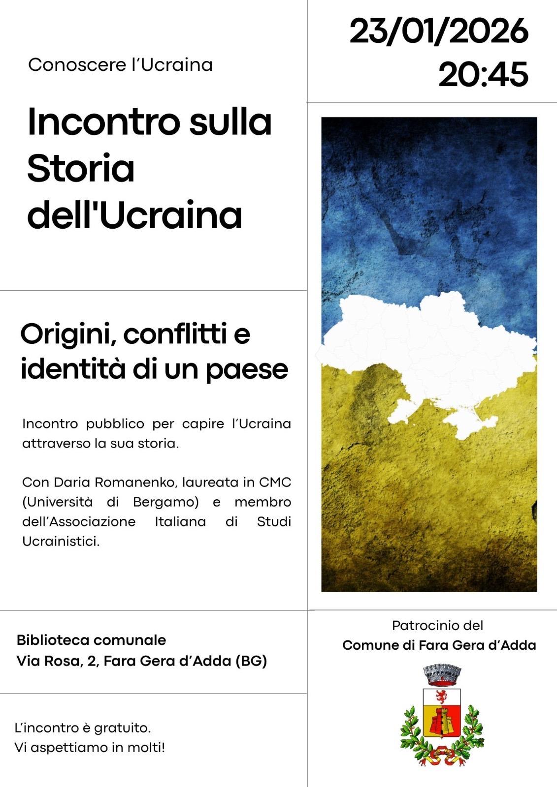 L'incontro dedicato alla scoperta dell'Ucraina si svolgerà Venerdì 23 gennaio alle 20:45 presso la Biblioteca Comunale in Via Rosa 2. L'evento è patrocinato dal Comune di Fara Gera d'Adda.