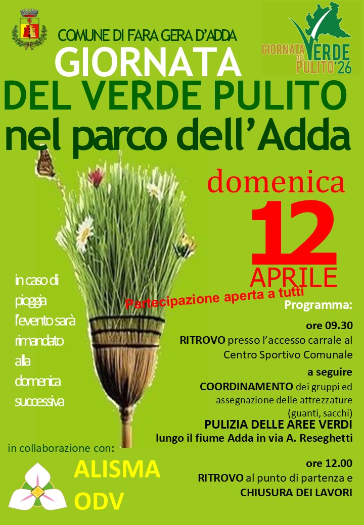 Domenica 12 aprile, al Parco dell'Adda, si svolgerà la Giornata del Verde Pulito, un'iniziativa organizzata dal Comune di Fara Gera d'Adda in collaborazione con Alsma odv. Il programma prevede il ritrovo alle 9.30 presso l'ingresso carrale del Centro Sportivo Comunale, seguito dalle attività di pulizia delle aree verdi situate lungo il fiume Adda, in Via A. Reseghetti. Alle ore 12.00 è previsto il ritorno al punto di partenza e la conclusione dei lavori.
