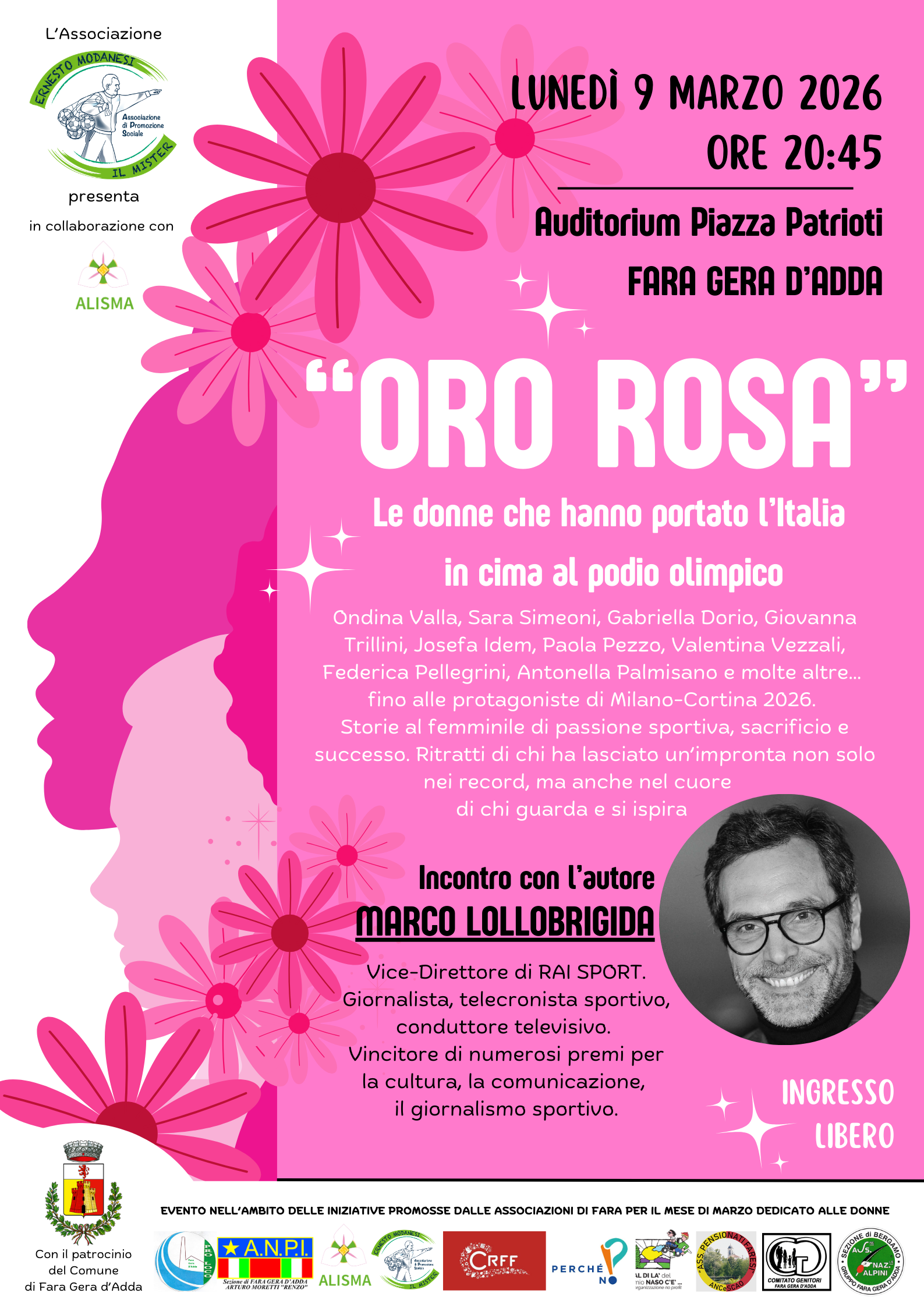 Lunedì 9 marzo alle ore 20.45, l'Associazione Ernesto Modanesi Il Mister, in collaborazione con Alisma, organizza presso l'Auditorium di Piazza Patrioti un incontro con Marco Lollobrigida, vicedirettore di Rai Sport e vincitore di numerosi riconoscimenti legati alla cultura, alla comunicazione e al giornalismo sportivo. L'evento, intitolato "Oro rosa," sarà dedicato alle donne che hanno portato l'Italia ai vertici olimpici, raccontando storie di passione sportiva, sacrificio e successo. Un omaggio a figure femminili che non solo hanno stabilito record, ma hanno anche lasciato un segno indelebile nel cuore di chi le osserva e trae ispirazione dal loro esempio.