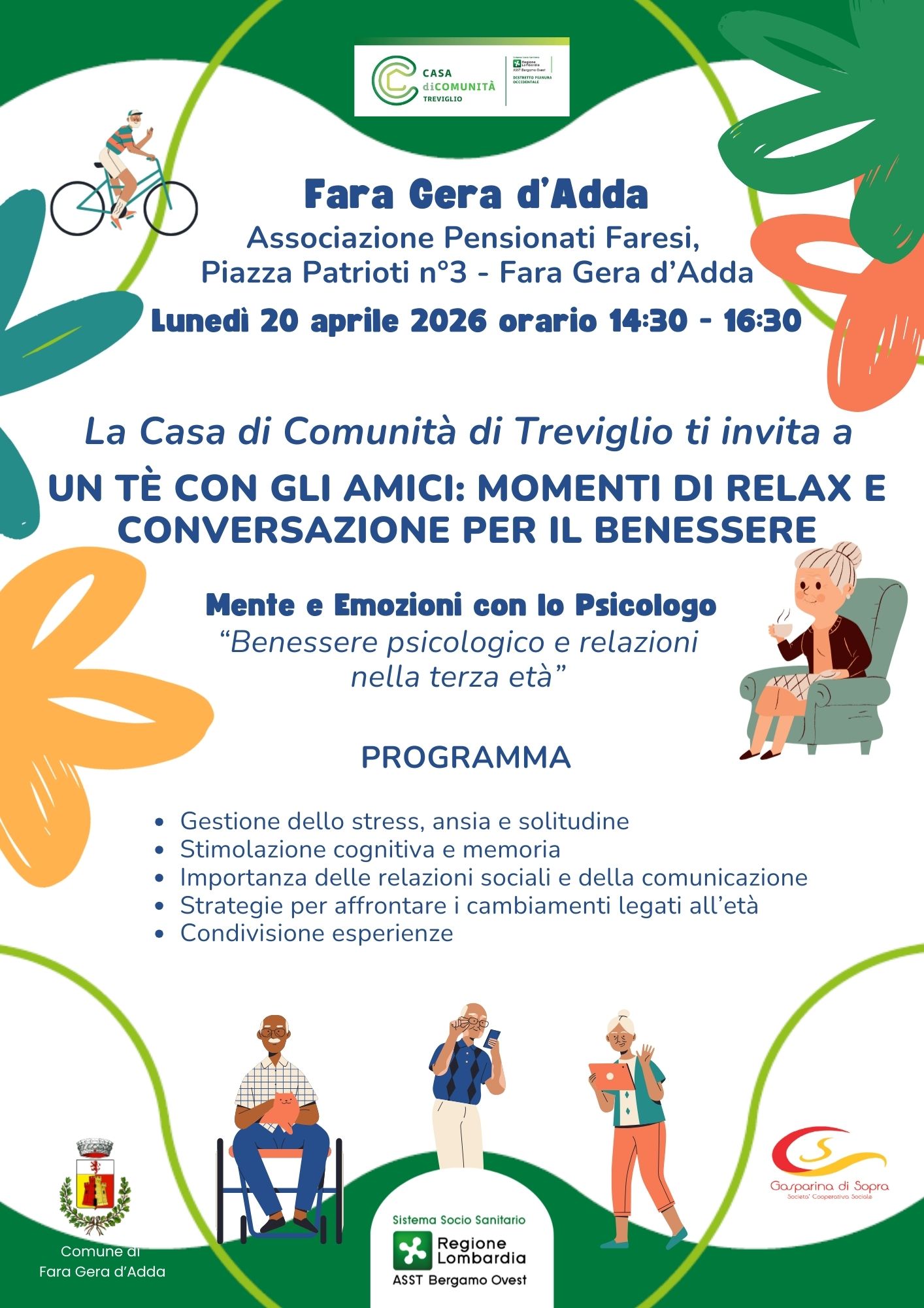 ll ciclo di incontri "Un tè con gli amici: momenti di relax e conversazione per il benessere", organizzato dalla Casa di Comunità di Treviglio e rivolto alla popolazione over 65 della zona, continuerà lunedì 20 aprile dalle 14:30 alle 16:30. Durante questo appuntamento si discuterà del benessere psicologico e relazioni nella terza età.